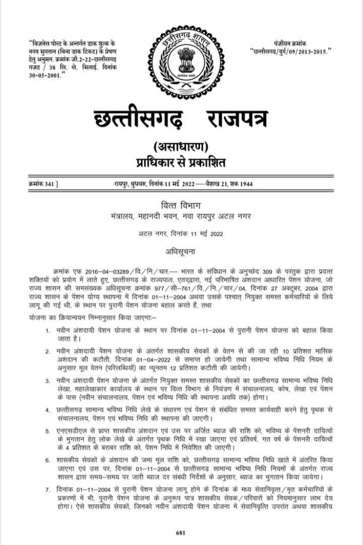 पुरानी पेंशन योजना बहाल, छत्तीसगढ़ राजपत्र में अधिसूचना प्रकाशित ..मुख्यमंत्री भूपेश बघेल ने किया ट्वीट..:-